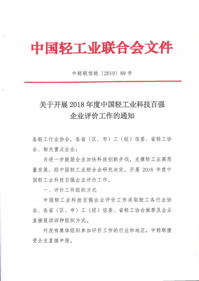 关于开展2018年度中国轻工业科技百强企业评价工作的通知