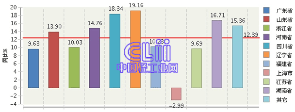图7 2013年1~8月主要地区家具行业规模以上企业累计主营业务收入增速情
