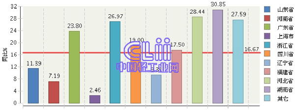 1~8月,家具行业累计利润居全国前十位地区的排名保持不变,依次是山东占16.59%,河南占14.22%,广东占12.71%,上海占9.30%,浙江占7.90%,四川占5.85%,辽宁占4.95%,福建占4.39%,河北占3.38%,湖南占2.89%(图6)。与1~7月相比,上述地区中前8个地区的各自占比均有所收窄。