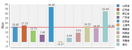 2013年1~10月全国文体行业利润较高的产区主要集中在山东、江苏、浙江地区,3个地区完成利润总额占全国的54.97%。山东省完成累计利润总额20.57亿元(占20.72%),同比增长15.85%;江苏省完成累计利润总额17.23亿元(占17.35%),同比增长17.23%;浙江省完成累计利润总额16.77亿元(占16.9%),同比增长11.71%。