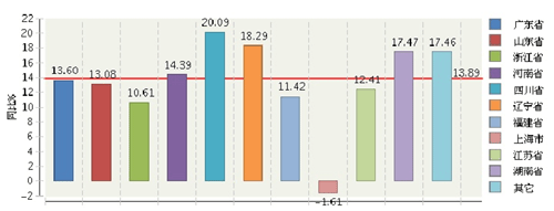 图7 2013年1~10月主要地区家具行业规模以上企业累计主营业务收入增速情况