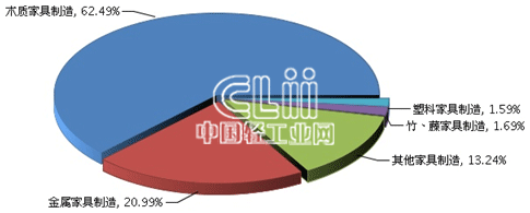 1~3月,木质家具制造业累计主营业务收入(下同)的占比达到62.49%;金属家具制造业次之,占比接近21;其他家具制造业居第三位,占比为13.24%;竹、藤家具制造业与塑料家具制造业这两个子行业的占比较小,均未超过2%(图4)。