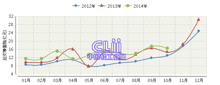 2014年全国家具行业连续三年月度应交增值税对比