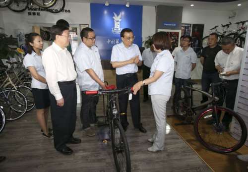 在出席夏季达沃斯论坛期间,中共中央政治局常委、国务院总理李克强在天津市委代理书记、市长黄兴国陪同下,在天津考察调研。6月26日走进飞鸽自行车天津胜利路体验店。这里摆放着不同档次、材质和性能各异的自行车。总理来到一辆碳纤维自行车前掂了掂重量,又亲自体验了一下这辆超级智能自行车的性能。他说,我愿为中国自行车做广告,更愿为“中国制造”智能升级“站台”。80年前,中国第一辆自行车在这家企业诞生。总理说,希望你们打造中国传统企业的“百年老店”。发扬勇于创新的企业家精神,追求精益求精的工匠精神,让老树不断发新芽,更加枝繁叶茂。