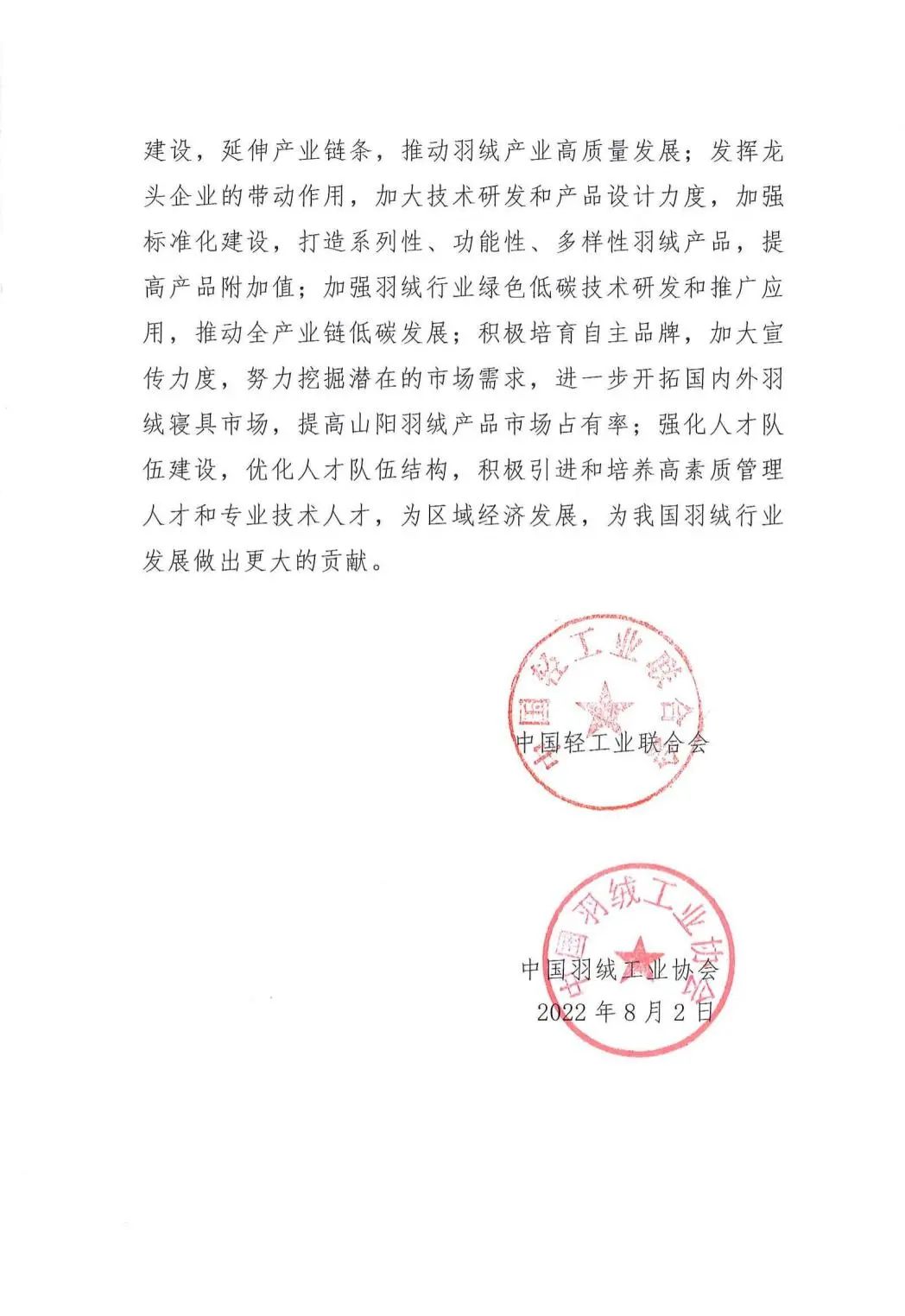 和中国羽绒工业协会共同授予“中国羽绒名镇·山阳”称号。2022年6月,经宝应县山阳镇人民政府申请,由
