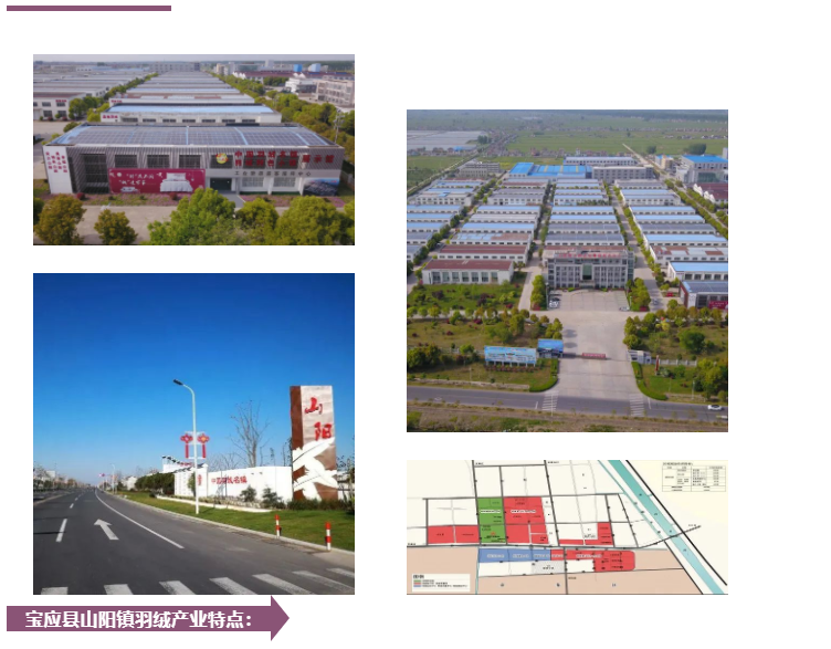 三、平台载体完备。为推动全镇羽绒企业的健康发展,山阳镇政府2017年5月创建宝应县山阳羽绒加工集中区,于2020年获批为“江苏省山阳羽绒加工集中区”。集中区还成立小微企业孵化中心、研发中心、电商中心,并新建配套羽绒文化、物流商业、科技创新等中心区域。2020年引进富安娜入户山阳建立区域物流电商中心,2022年投资200多万元建设羽绒展示中心和检测中心。