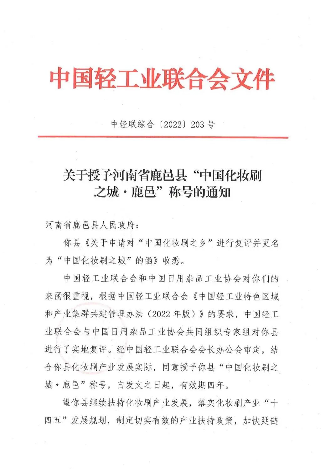 和中国日用杂品工业协会共同授予“中国化妆刷之乡·鹿邑”称号。2022年3月,经河南省鹿邑县人民政府申请,由