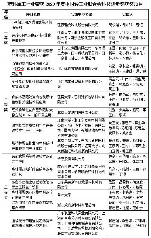 大会还对第二批轻工大国工匠,2020年度 科学技术发明奖、进步奖获得者和全国联社系统先进集体进行了表彰。其中塑料加工行业的天津军星管业集团有限公司董事长夏成文、金后盾集团董事长李彦平荣获“第二批轻工大国工匠”称号;3个塑料加工行业相关项目获得2020年度 技术发明奖;15个塑料加工行业相关项目获得2020年度 科技进步奖。此外还有部分塑料行业企业当选 第五届副会长、常务理事和理事单位。