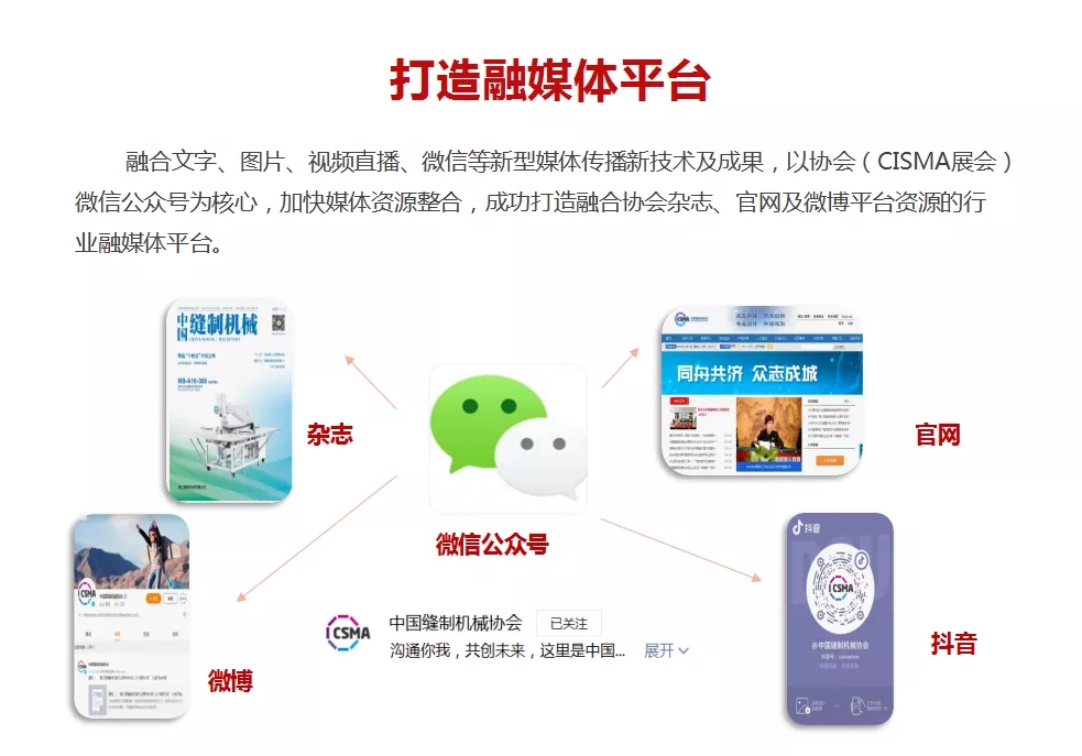 一是升级媒体传播渠道。围绕行业信息需求,与时俱进融合文字、图片、视频直播、微信等新型媒体传播新技术及成果,以协会和CISMA展会微信公众号为核心,加快媒体资源整合,成功打造融合协会杂志、官网及微博平台资源的行业融媒体平台。
