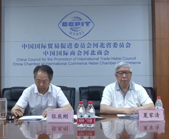 河北省贸促会二级巡视员、河北省国际商会副主席张辰刚发言,河北省皮革行业协会名誉会长夏家清参加会议