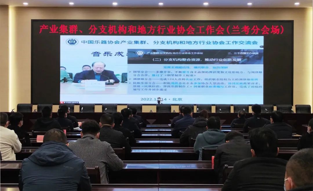 2022年11月14日,中国乐器协会产业集群、分支机构、地方行业协会工作会议在京召开。分布在上海、江苏、浙江、贵州、河北、山东、北京、广州等地的产业集群、分支机构、地方行业协会及乐器企业代表等,共78个终端130余人线上参加会议。