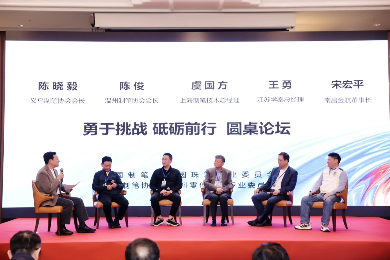 大会组织了《勇于挑战、砥砺前行》圆桌论坛会,点石文具用品有限公司董事长王元鸿主持,浙江义乌制笔协会会长陈晓毅、温州制笔协会会长陈俊、上海制笔技术服务有限公司总经理虞国方、江苏学泰印务有限公司总经理王勇、南昌市金航五金制品有限公司董事长宋宏平代表参与。