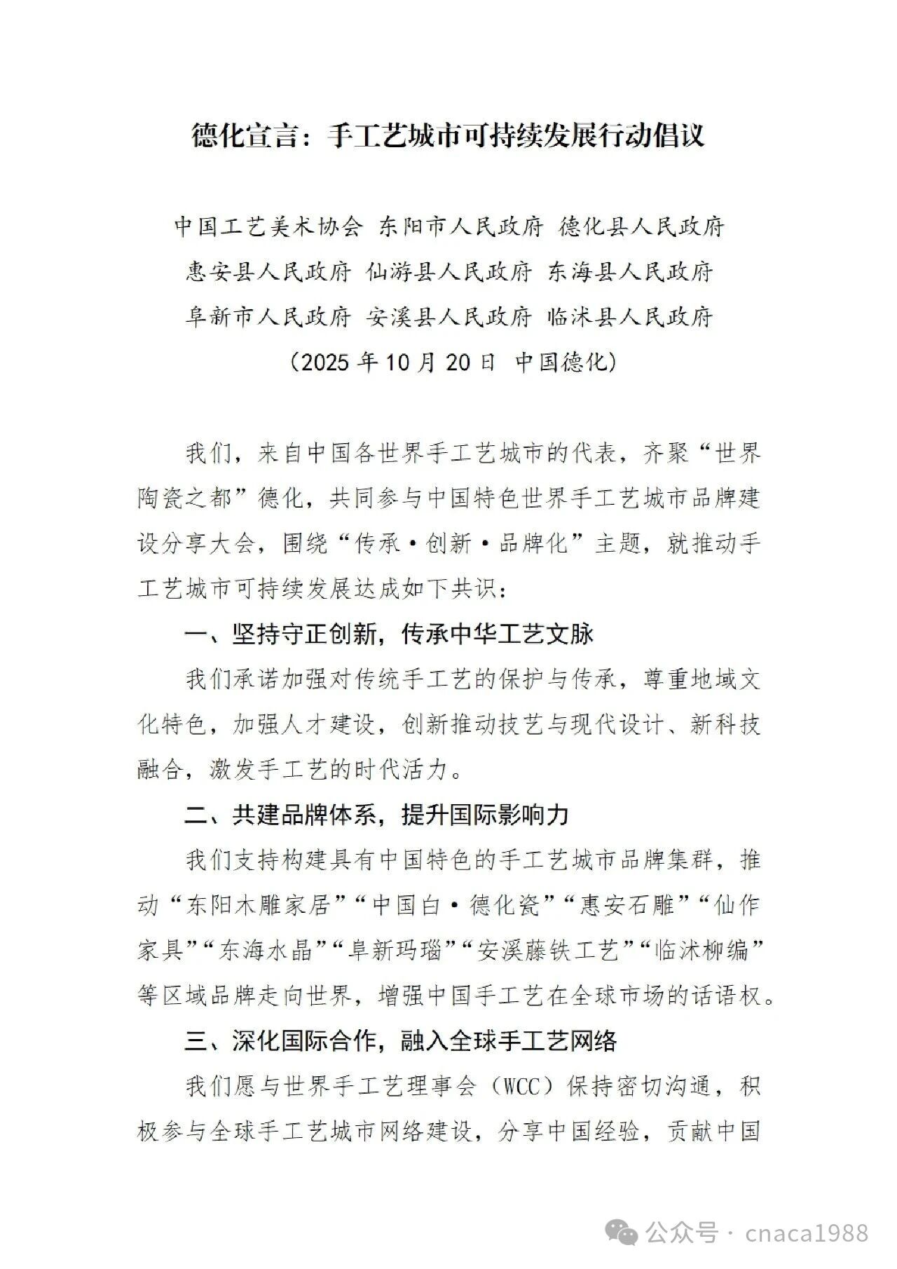中国工艺美术协会与东阳、德化、惠安、仙游、东海、阜新、安溪、临沭八个世界手工艺城市共同发起《德化宣言》