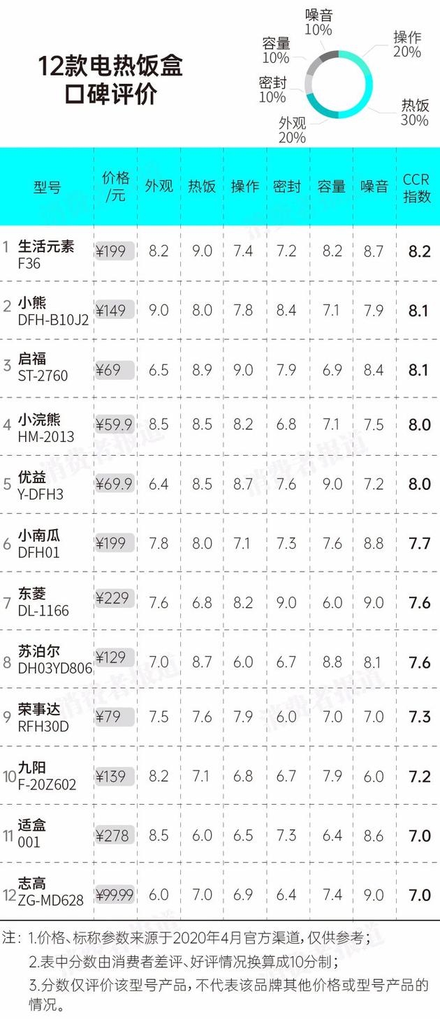 综合消费者评价中的外观、热饭、操作、密封、容量、噪音等6个维度,得出12款电热饭盒的综合评价。