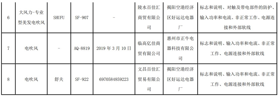海南省抽查34批次电吹风产品 不合格8批次