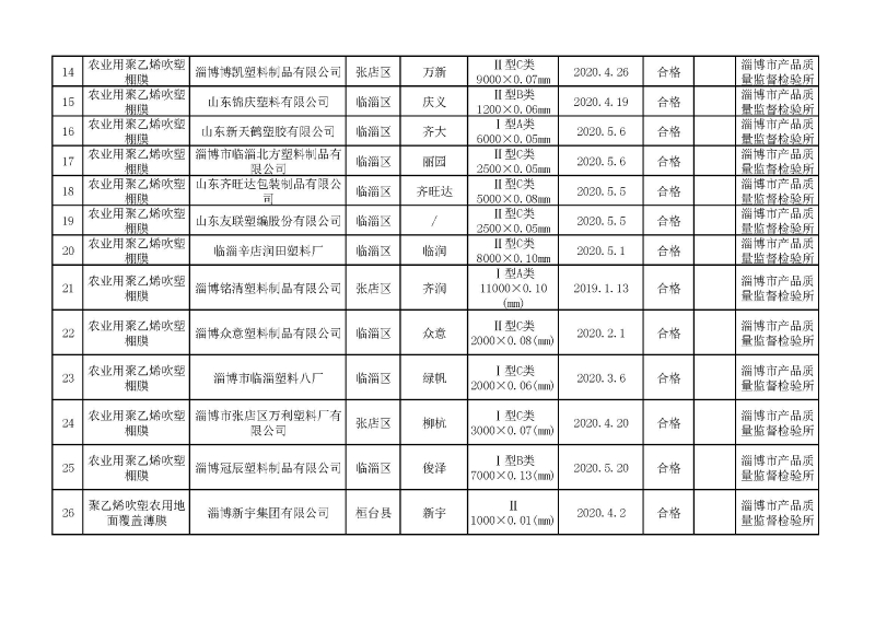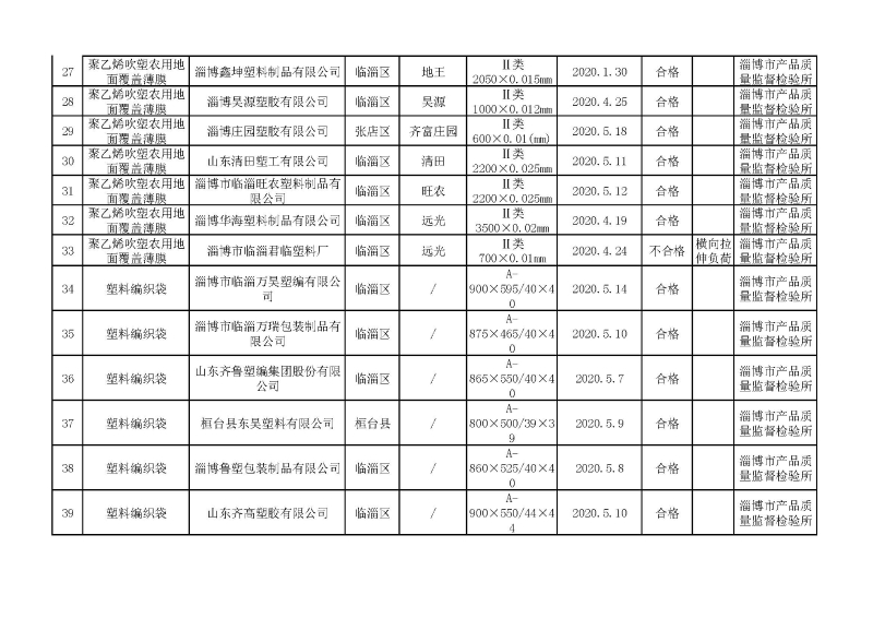 依据GB 13735-2017聚乙烯吹塑农用地面覆盖薄膜;GB 4455-2006农业用聚乙烯吹塑棚膜及产品明示质量要求,对农业用聚乙烯吹塑棚膜、聚乙烯吹塑农用地面覆盖薄膜厚度、纵向拉伸负荷;横向拉伸负荷;纵向断裂伸长率;横向断裂伸长率;纵向直角撕裂负荷;横向直角撕裂负荷;透光率;雾度;初滴时间;流滴失效时间等项目依据产品执行标准进行了检验。抽查了32家企业生产的32批次产品,合格31批次。