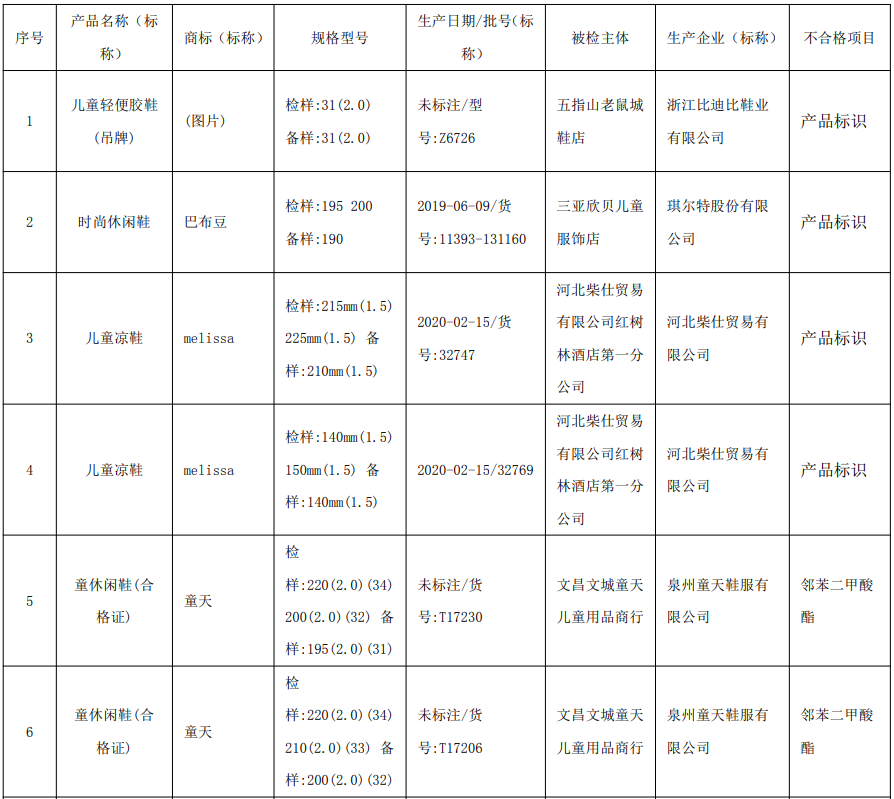 2020 年下半年海南省流通市场童鞋产品质量监督抽查不合格产品