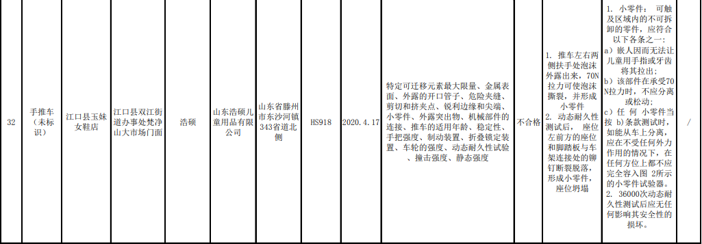 据公告,本次共对20家销售者销售的35批次童车产品质量开展了监督抽查,涉及贵州省贵阳市、遵义市、安顺市、铜仁市、毕节市、六盘水市、黔东南州、黔西南州、黔南州9个市(州)。本次监督抽查依据GB 14746-2006《儿童自行车安全要求》、GB 14747-2006 《儿童三轮车安全要求》、GB 14748-2006《儿童推车安全要求》、GB 14749-2006《婴儿学步车安全要求》等标准要求进行检验。经检验,发现8家销售者销售的9批次产品不合格,不合格指标为稳定性、动态耐久性、车轮强度、座位、危险夹缝、小零件、危险夹缝及孔、开口、静态强度,不合格发现率为25.71%。具体抽查结果见附件。