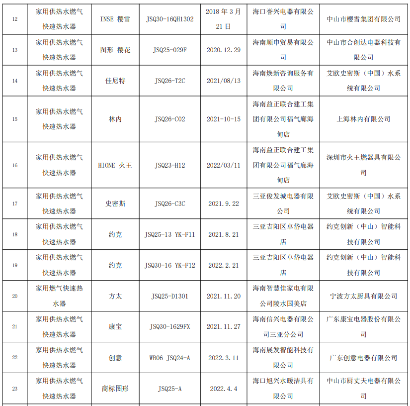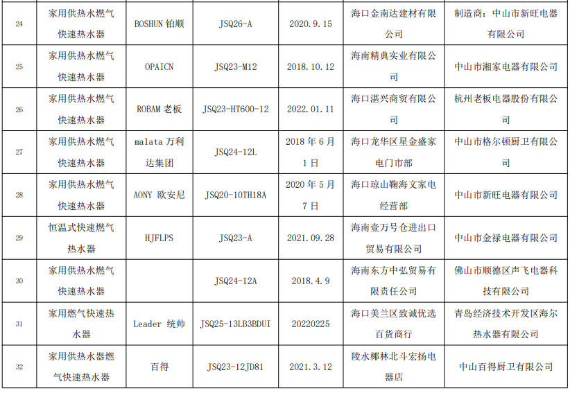 据海南省市场监督管理局网站2022年11月3日消息,近期,海南省市场监督管理局对全省流通市场家用燃气快速热水器产品进行了监督抽查。本次抽查了40批次产品,不合格2批次。