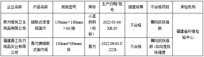 不合格样品包括泉州恒悦卫生用品有限公司的1批次抽取式保湿纸面巾、福建晋江凤竹纸品实业有限公司的1批次抽取式面巾纸。