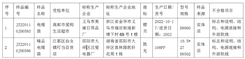 不合格产品为:1批次“樱贝”电暖袋;1批次“凯允”精品电暖袋。