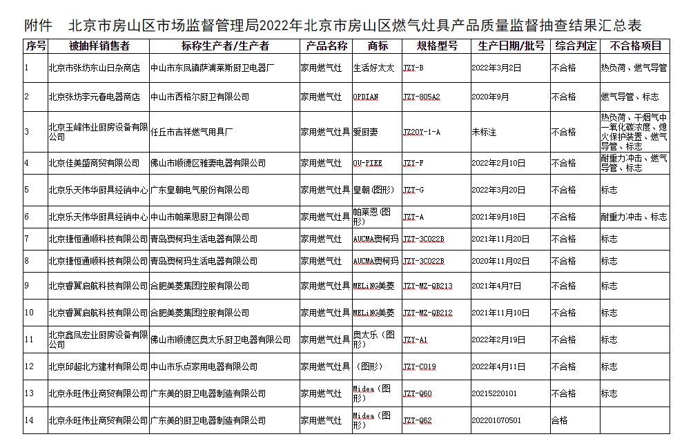 北京市房山区抽查14批次燃气灶具,13批次不合格