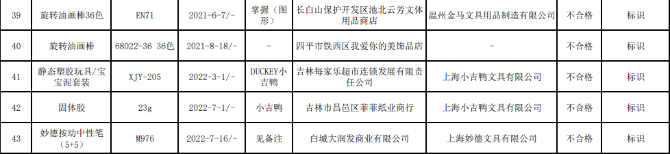 不合格产品标称生产单位涉及,吉林省万企通商务印刷有限公司、吉林省多彩印刷有限公司、辽宁省海城市佳信印刷厂、通化县长城纸业有限公司、汕头市澄海区乐吧玩具厂、广东得培力文创科技有限公司、长春市丽祥文化用品印务有限公司、江苏长江纸业有限公司、平乡县圣杰童车厂、上海小吉鸭文具有限公司台州分公司、安硕文教用品(上海)股份有限公司、上海妙德文具有限公司、佛山市智慧创意文具有限公司等。