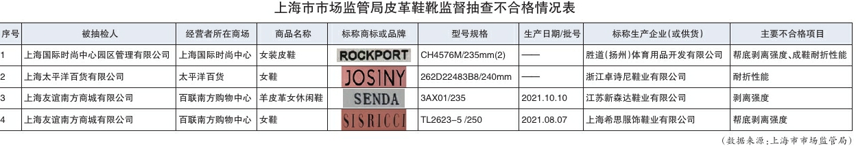 鞋子易开口开胶、鞋底易断裂……近日,记者从上海市市场监管局获悉,该局对40批次皮革鞋靴进行了监督抽查,其中4批次产品不合格,涉及ROCKPORT、JOSINY等品牌。