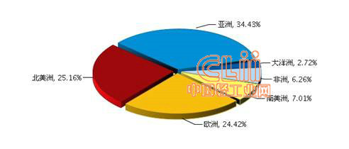 图8 2013年1~9月全国陶瓷行业累计出口额各大洲占比情况