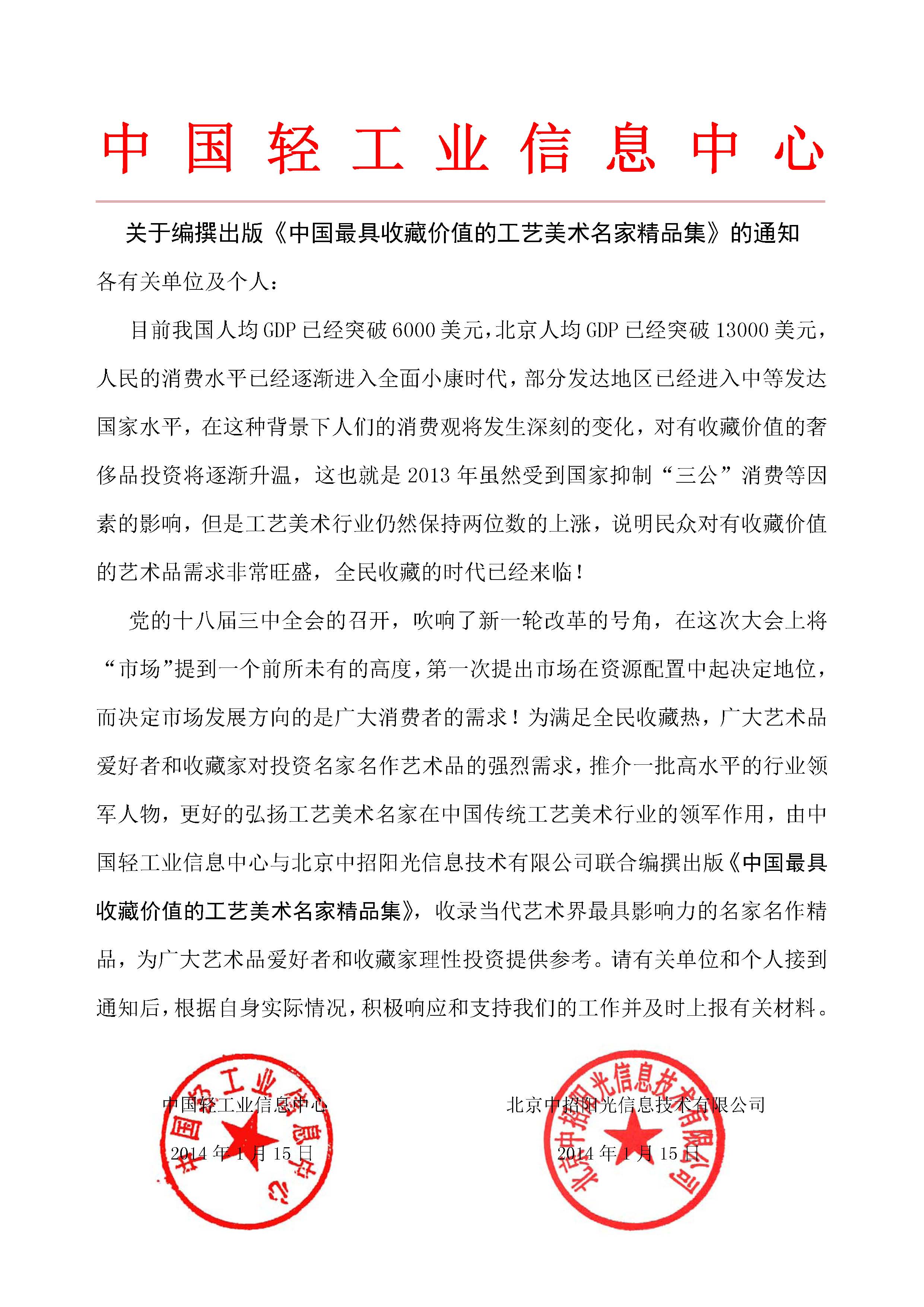 关于编辑出版《中国最具收藏价值的工艺美术名家精品集》的通知