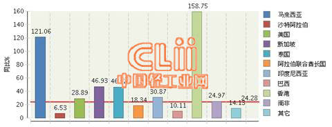 与上年相比,对马来西亚、新加坡、泰国的出口额快速增长,累计同比增速分别为121.06%、46.93%、46.12%,出口额占比分别有上年的第5、7、8位,提升至第1、4、5位。在出口额占比前十的贸易国中,仅沙特阿拉伯的出口同比增速在10%以下。