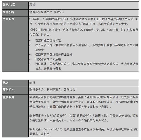 美国、欧盟、加拿大和澳大利亚的管制机构包括美国消费品安全委员会(CPSC)、欧盟委员会、欧洲议会和欧洲理事会、加拿大卫生部和澳大利亚竞争与消费者委员会(ACCC)。这些管制机构负责制定关于消费者产品(包括玩具和儿童产品,如儿童护理用品和儿童珠宝)方面的法规规定。