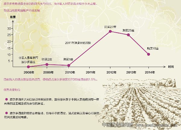 中国人购置波尔多酒庄最早是在2008年,2009年购买了两座酒庄,2010年仅购一座,2011年速度开始加快,2012年购买数量猛增为27座,2013年为25座,2014年仅购入10座。目前购入的酒庄数量虽然过百,但也仅占波尔多地区约7000座酒庄的1.5%。