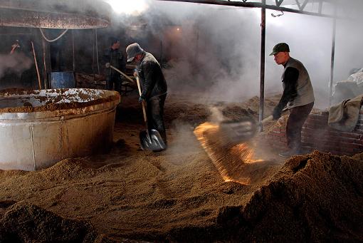 近两年,白酒市场遭遇“滑铁卢”,泸州部分小酒厂悄然关闭。然而,5月初,笔者来到泸州市江阳区石寨镇金银村周永平的酒厂时,只见酿酒车间内雾气弥漫,几个工人正热火朝天忙着起运刚出酒的高粱糟子,一派繁忙。