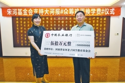 昨天上午,河南省宋河老子国学教育基金会(以下简称宋河教育基金会)50万元支持大河报众筹“鸡蛋换学费”交接仪式,在郑东新区CBD宋河基金会办公地举行。已连续两年牵手大河报“鸡蛋换学费”公益助学活动后,今年,旨在“传递爱·让梦想飞”的宋河教育基金会,继续鼎力支持,联合大河报拿出50万元专项善款支持助学。