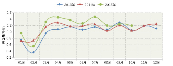 图: 2013年-2015年10月我国钢琴进口量月度走势