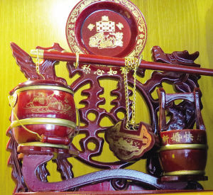 子孙桶是绍兴人婚嫁时女方必备的物品,“女儿红”将这种物品组合成礼品,有马桶,又有水桶和秤,小巧玲珑,推带方便,成为具有收藏价值的工艺品,深受市民的喜爱。而其中的“红红”盒装喜酒已经走进绍兴众多人的喜宴上,成为分发喜糖喜酒的佳品。