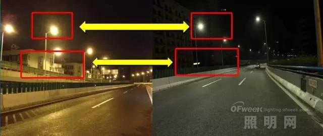 上海内环线改造前后的实例,高压钠灯照明光晕及杂散光对周围居民房屋影响很大,而LED灯照明几乎对周围居民房屋无影响,精准配光、截光好不仅光污染小,而且光度利用率高。