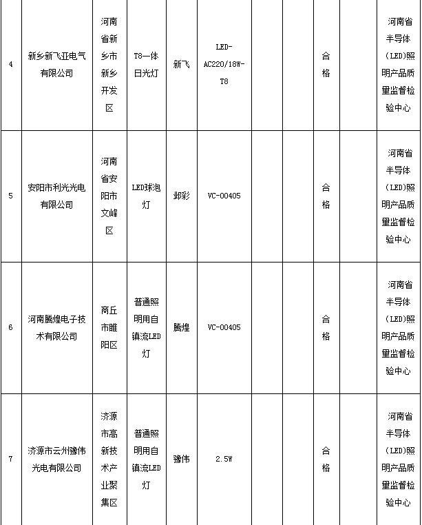 中国质量新闻网讯 河南省质量技术监督局于2015年第2季度对家用纸制品(除卫生纸外)等64种产品质量进行了省监督抽查,并于2016年12月14日在其官网将抽查结果予以公布。其中,抽查了郑州、安阳、新乡、商丘、济源5个省辖市7家企业生产的7批次普通照明用自镇流LED灯产品,经抽样检验,7批次产品全部符合标准要求。