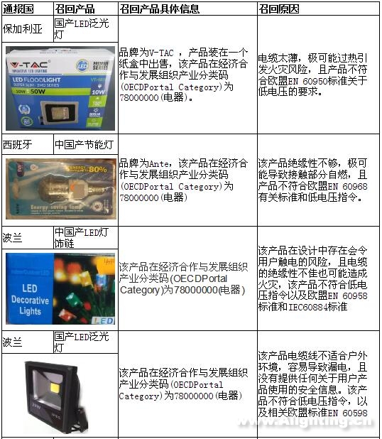 2月,欧盟委员会非食品类快速预警系统召回3款中国产LED灯具。其中“ATOPSUN”牌灯具和“GT Industrial”牌灯具带电部件与易接触金属之间的电绝缘不足,用户有被电击的危险。2款产品均不符合《欧盟低压电指令》及欧洲相关标准EN 60598的要求。另一款“Party Lighting”牌灯具含有短链氯化石蜡,具有致畸、致病、致突变的毒性,检测值高达1.1%,不符合《欧盟持久性有机污染物法规》的要求。
