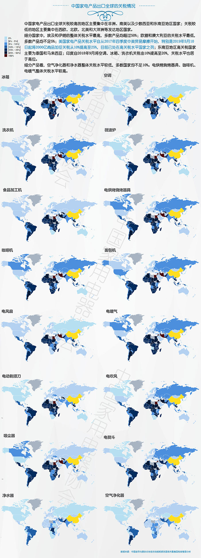 在全球贸易摩擦频繁发生的背景下,中国家用电器协会梳理分析了中国家电产品出口全球关税的情况(截止2018年)。目前,中国家电产品出口全球关税较高的地区主要集中在非洲、南美以及少数西亚和东南亚地区国家;关税较低的地区主要集中在西欧、北欧、北美和大洋洲等发达地区国家。其中美国家电产品关税水平自从2017年四季度中美贸易摩擦开始,特别是2019年5月10日起将2000亿商品加征关税从10%提高至25%,目前已处在高关税水平国家之列。