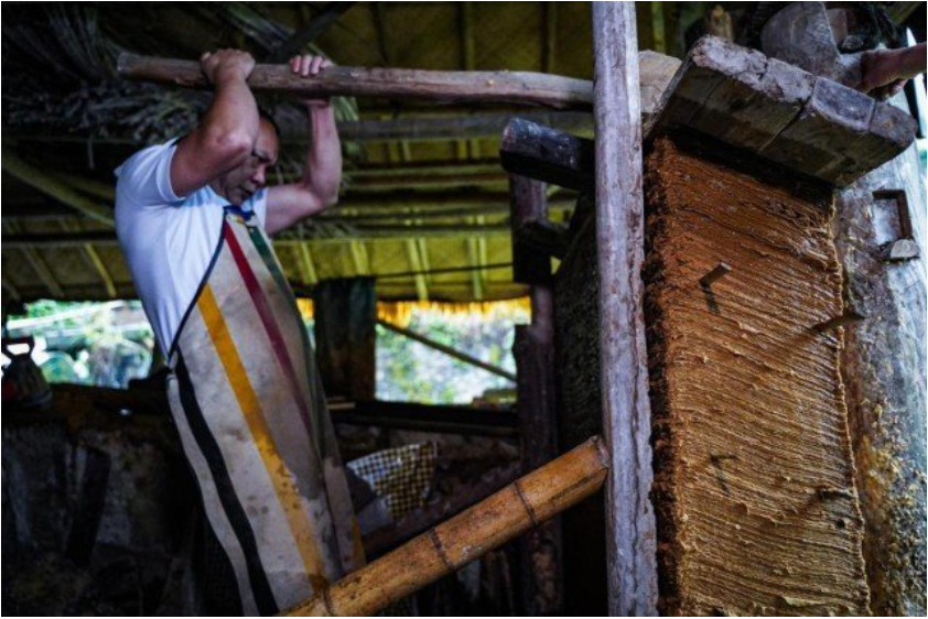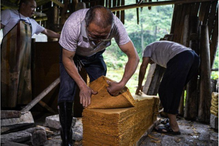在这个造纸作坊里,还保留着各种木制造纸器具和设备,诸如大石筒、纸浆槽、压纸台、分纸台等。古法做竹纸的工序很复杂,需要经过砍竹、剥开、腌制、漂洗、发酵、碾碎、抄纸、压纸、揭纸、晒纸等多道工序,完整的竹子才能变成一张张有着淡淡竹香的纸。这种技艺保留着最原始、古老的造纸工艺流程和方法,与《天工开物》中记载的土法造纸大致相同。