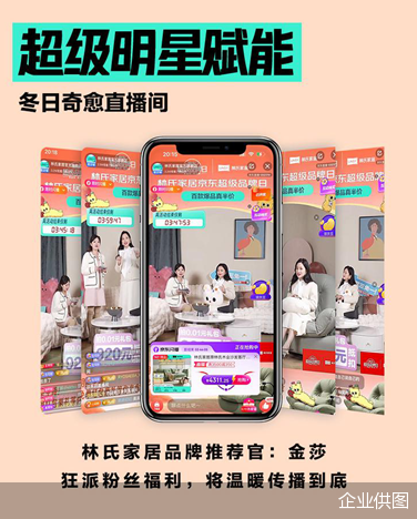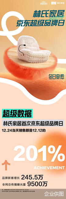 12月24日,自入驻京东平台以来参与的首次“超级品牌日”,林氏家居就上线“林氏家居X京东超级品牌日的#冬日奇愈 直播间”,并邀请了国民女神金莎作为「品牌推荐官」,为粉丝分享居家好物。据林氏家居公布的数据,12月24日当天,品牌的新客增长量达到245.5万,全网总传播曝光量9500万+,当日的成交额相比“12.12”更是实现了翻番。