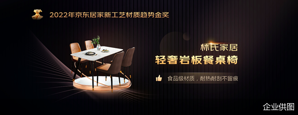 早在9月23日,在北京召开“用热爱·设计家”发布会,万众瞩目的2022京东居家新趋势金榜揭晓。其中,林氏家居凭借其研发设计的爆品——王一博同款“轻奢岩板餐桌椅”,摘取了2022京东居家新工艺材质趋势金奖这一桂冠。