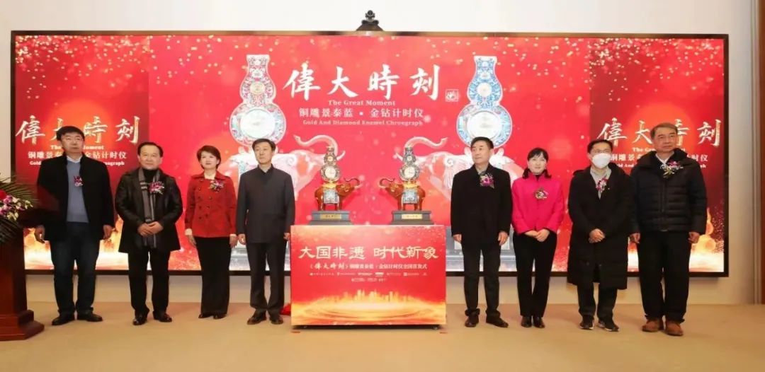 2月11日,《伟大时刻》铜雕景泰蓝·金钻计时仪在中国工艺美术馆·中国非物质文化遗产馆隆重首发。在著名艺术设计教育家、中国工艺美术学会名誉会长常沙娜,中国文物学会副会长、国家级非物质文化遗产古钟表修复技艺代表性传承人王津指导下,由中国工艺美术大师、国家级非物质文化遗产铜雕技艺代表性传承人朱炳仁,中国工艺美术大师、国家级非物质文化遗产景泰蓝技艺代表性传承人钟连盛,北京市工艺美术大师、北京市非物质文化遗产景泰蓝技艺代表性传承人衣福成,山东烟台传统钟表制作技艺代表性传承人、德国赫姆勒-美时嘉设计研发中心副主任高力,六位名家首度跨界合作,集铜雕、铜胎掐丝珐琅、钟表机械、黄金压铸、珠宝镶嵌、金属錾刻、金属铸造、花丝烧蓝八大技艺于一身,创作出《伟大时刻》铜雕景泰蓝·金钻计时仪,以此祝福祖国开启伟大新征程,铭记向着第二个百年奋斗目标进军的伟大时刻,彰显出一幅国泰民安、蓬勃昂扬的大国气派与辉煌壮丽、锦绣华美的盛世景象。