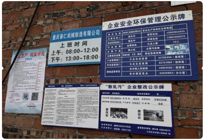 重庆春仁机械制造有限公司厂房墙外,上班时间、“散乱污”企业守法告知承诺书、“散乱污”企业整改公示牌以及安全生产有奖举报等信息一一张贴。