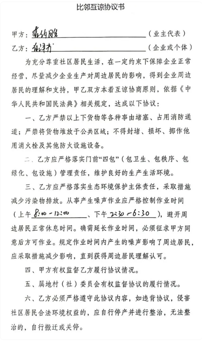 这背后源自一张“比邻互谅协议书”。协议书的甲方为周边业主代表、乙方为企业或个体经营户,两方在社区牵头下互谅协商,保障企业或个体经营者能够正常营运,但同时也要减少噪音、污染,严格落实门前“四包”(包卫生、包秩序、包绿化、包设施),控制作业时间等等。