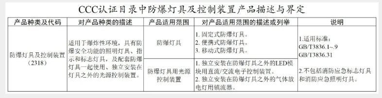 ● 2025年5月1日起,列入CCC认证目录的防爆灯具及控制装置,应当经过CCC认证并标注CCC认证标志后,方可出厂、销售、进口或者在其他经营活动中使用。相关产品描述与界定详见下表。