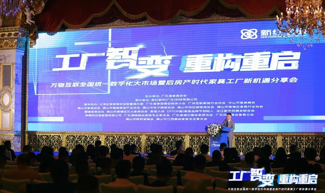4月9日,以工厂“智”变、重构重启为主题,由广东省家具协会主办、新红数科(广东)科技有限公司承办,以及省内20余家家具商协会联合发起协办,万物互联全国统一数字化大市场暨后房产时代家具工厂万亿新机遇分享会,在佛山罗浮宫索菲特酒店盛大举行。会上,省家具行业数字化转型工作领导小组组长、省家具协会王克会长讲话,联合发起商协会代表广州市定制家居协会王天兵会长致欢迎辞,新红数科(广东)科技有限公司朱玉山董事长,省家具行业数字化转型工作小组副组长、省泛家居产业数字化生态圈系统架构师周建军博士分别做主题分享。来自全省各商协会会长、秘书长及400余家家具企业负责人出席。会议由新红数科(广东)科技有限公司刘先乔总裁主持。