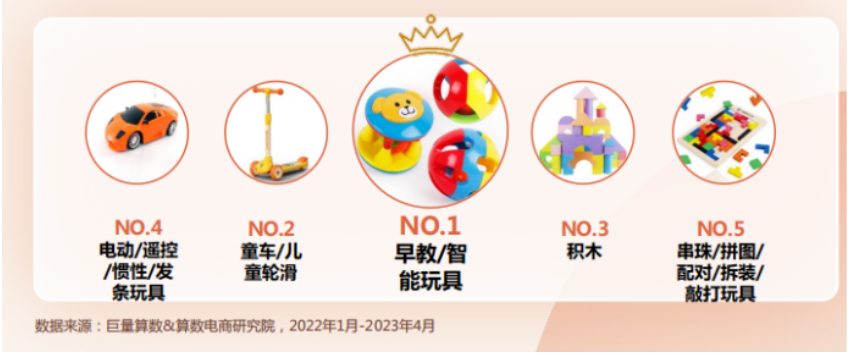 在抖音平台上(巨量算数&算数电商研究院2022年1月-2023年4月),益智玩具相关的内容播放量在所有儿童玩具细分类目中遥遥领先,且智能公仔/娃娃、积木、拼图/拼板等适用于不同年龄阶段儿童且带有“益智”属性的玩具,播放量均处于靠前位置,可见“益智性”已经成为用户对儿童玩具的“刚需”。